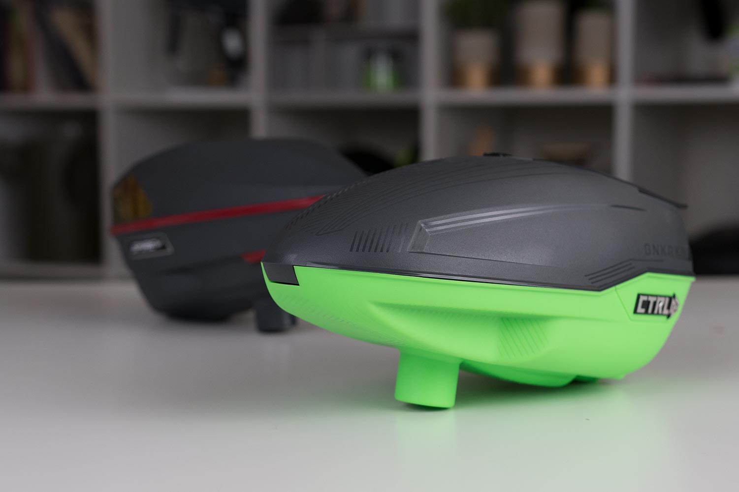 Now hat the CTRL is out and we can hold it, it’s surprisingly small, really very small, there are other small hoppers like the HK Army Speed. Holding the Speed in had also feels super small, and it is, but it’s much taller than the CTRL and that’s kind of what matters. Most of the time when you are getting shot at you are shooting back so your front is showing, so you want your front area to be as small as possible. With the taller loader like the HK Army Speed your front is just bigger. While one-hopper might be smaller than another technically the frontal area is the most important. The closest loader size-wise is probably the Dye Rotors, the LTR its maybe 15% bigger and the R2 around 10% bigger. 10% might not sound like much, and really it’s not, but you can tell a difference in person.