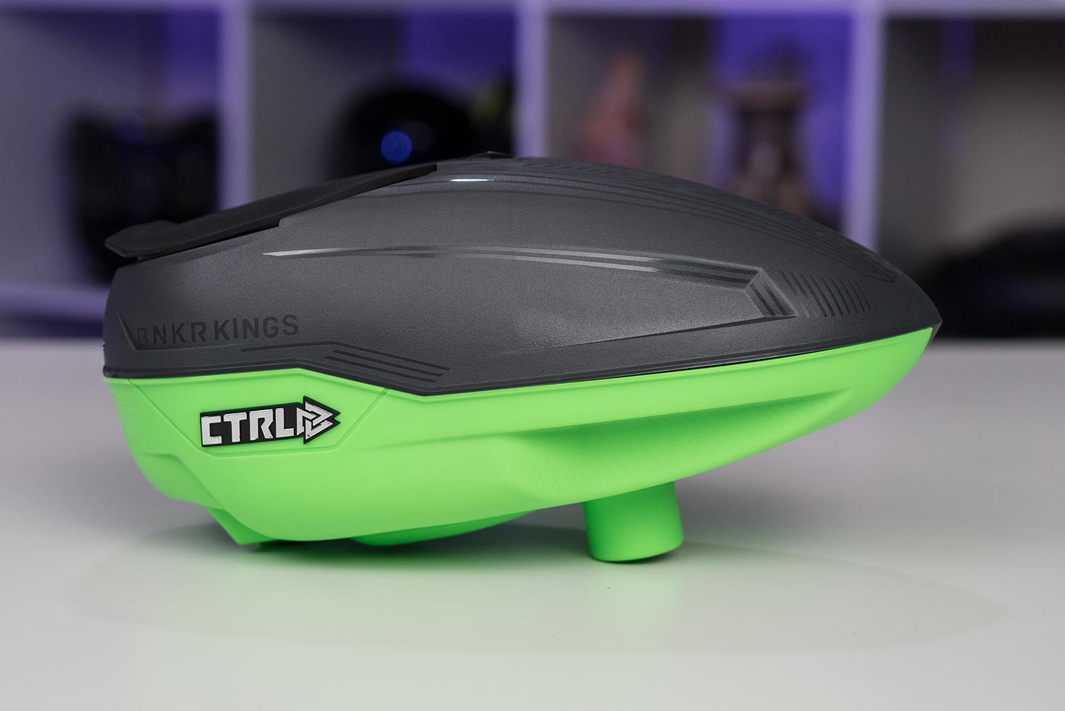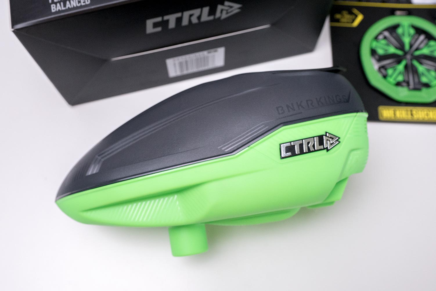 On the inside are the very simple and familiar internals of the Spire. Bunkerkings is owned by Virtue. The CTRL, you should expect performance to be very similar to the Spire III, which is great because the Spire III feeds very easily of paint and feeds extremely consistent. The main grip about the Spire’s is that they don’t feed as fast as some other loaders like the Dye Rotors. To improve the feed rate Bunkerkings have cut off any access material on the drive cone to help reduce the weight. Reducing weight would help it spin quicker and thus feed quicker, Bunkerkings has also added “Enhanced Proactive Feeding Logic” software…